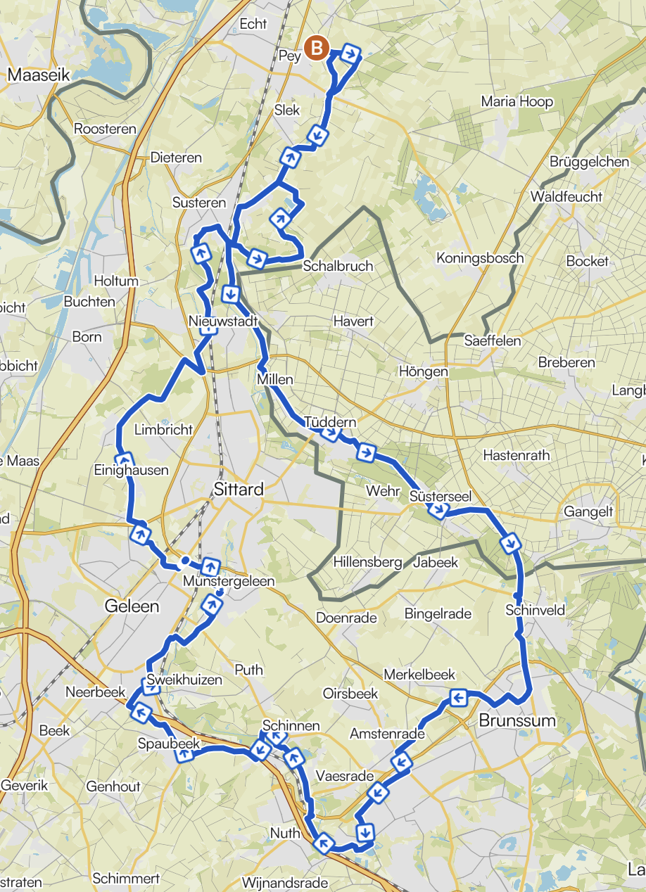 Het ging zuidwaarts, voor het precieze verloop van de route verwijs ik naar het kaartje onderaan dit relaas. Tussen Susteren en Nieuwstadt staken we de grens naar Duitsland over en passeerden bekende dorpen via bekende wegen. Via de voormalige ‘neutrale weg’ fietsten we bij Schinveld weer Limburg binnen, en daar deed, vermoed ik, een weg-afsluiting het plan van Annie&Mat in duigen laten vallen. Maar aangezien we de streek als de spreekwoordelijke broekzak kennen, werd de weg-afsluiting in een vloeiende beweging gepasseerd, en werd iets nieuws bedacht. Met een kleine omweg door het prachtige Brunssum belandden we (toch?) in Amstenrade. Tot hier was het wat vals-plat omhoog-omlaag geweest, maar genoeg voor Geert om aan te geven dat hij er inmiddels tabak van had. Maar hij werd gerustgesteld dat het hierna afgelopen was. Wat ook zo wel bleek te zijn, op een tunneltje of brugje na.