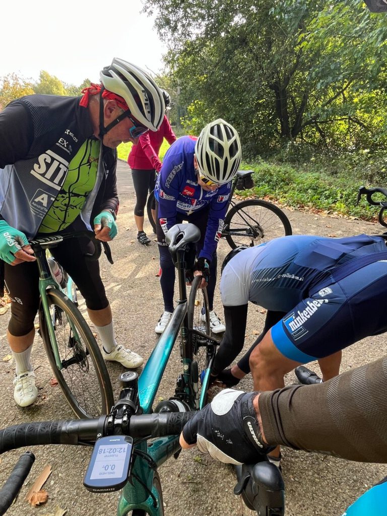 De reden was een lekke voorband bij Har en nadat die vakkundig met hulp van Piet en John gefixed was bleek Leon’s achterband ook niet 100%. Wiel probeerde de band nog op zijn plek te masseren, er zou iets van de binnenband uitsteken (zeg maar zoals bij een liesbreuk) maar het zat allemaal wat tegen, gedoe met de CO2 om de band op te pompen, vervolgens het edele handpompwerk waarop de binnenband het toch begaf. Dus vervolgens dan ook hier maar een nieuwe binnenband plaatsen.